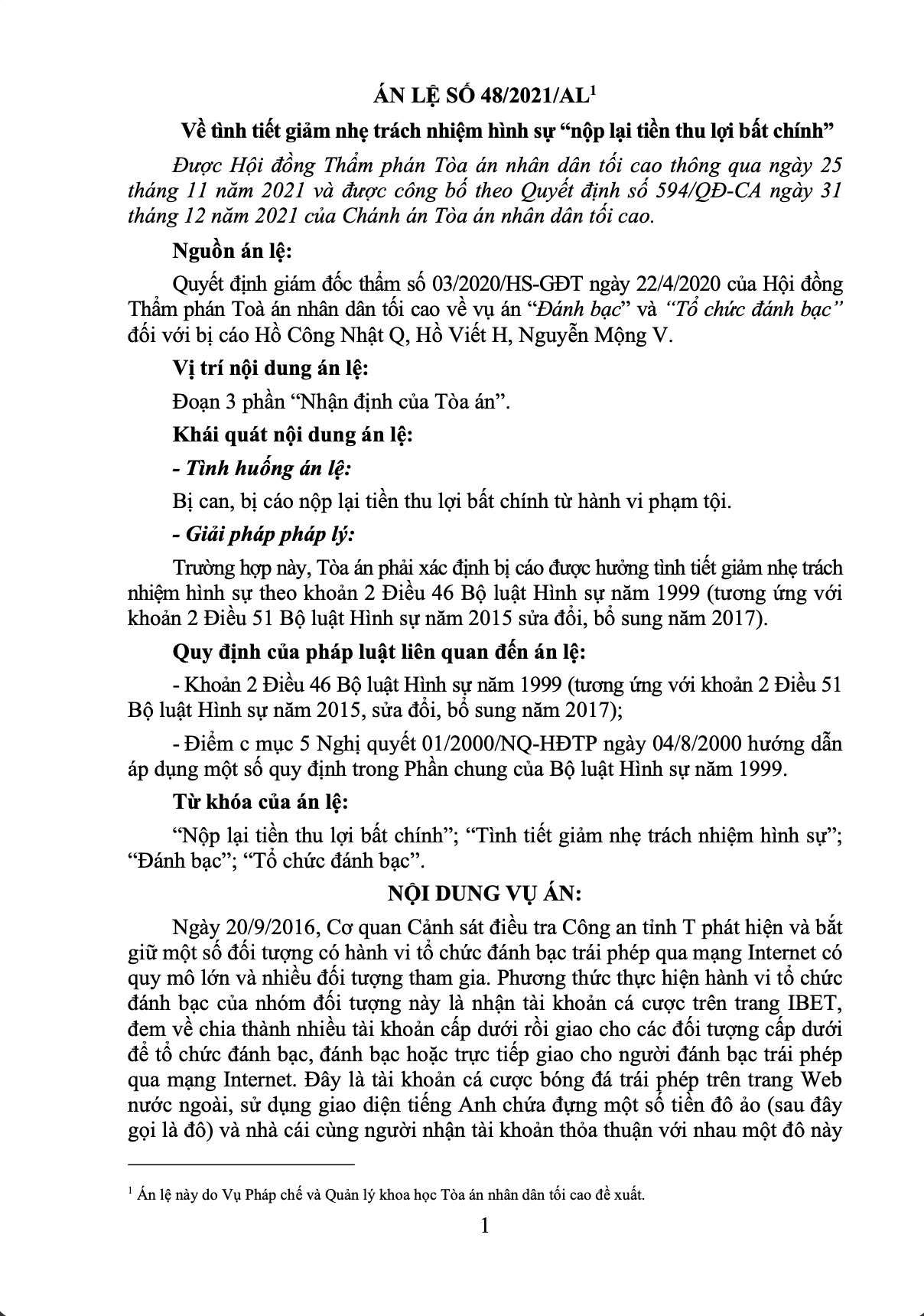 Hỏi đáp ÁN LỆ SỐ 48/2021/AL VỀ TÌNH TIẾT GIẢM NHẸ TRÁCH NHIỆM HÌNH SỰ “NỘP LẠI TIỀN THU LỢI BẤT CHÍNH”