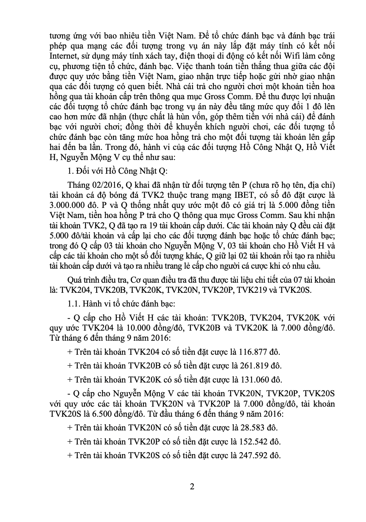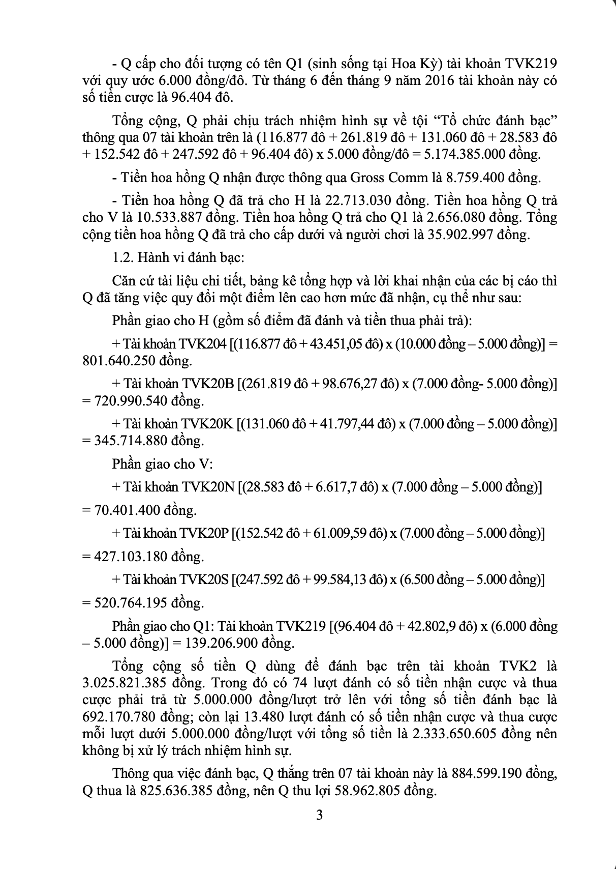 - Hồ Công Nhật Q: Tháng 02/2016, Q nhận tài khoản tổng TVK2 (quy ước 5.000 đồng/đô) rồi chia thành 19 tài khoản con, cấp lại cho H, V cùng một số đối tượng khác và giữ lại một phần để tự cá cược. Về hành vi "Tổ chức đánh bạc", Q phải chịu trách nhiệm hình sự với tổng số tiền giao dịch hơn 5,17 tỷ đồng. Về hành vi "Đánh bạc", thông qua việc nâng mức quy đổi đô ảo, Q đã trực tiếp đánh bạc với tổng số tiền bị xử lý hình sự là hơn 692 triệu đồng (chỉ tính các lượt đánh trên 5 triệu đồng), qua đó thu lợi bất chính gần 59 triệu đồng.