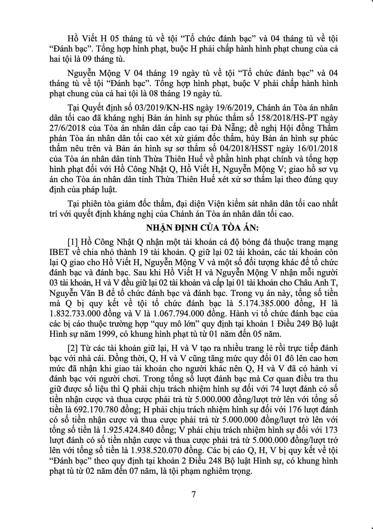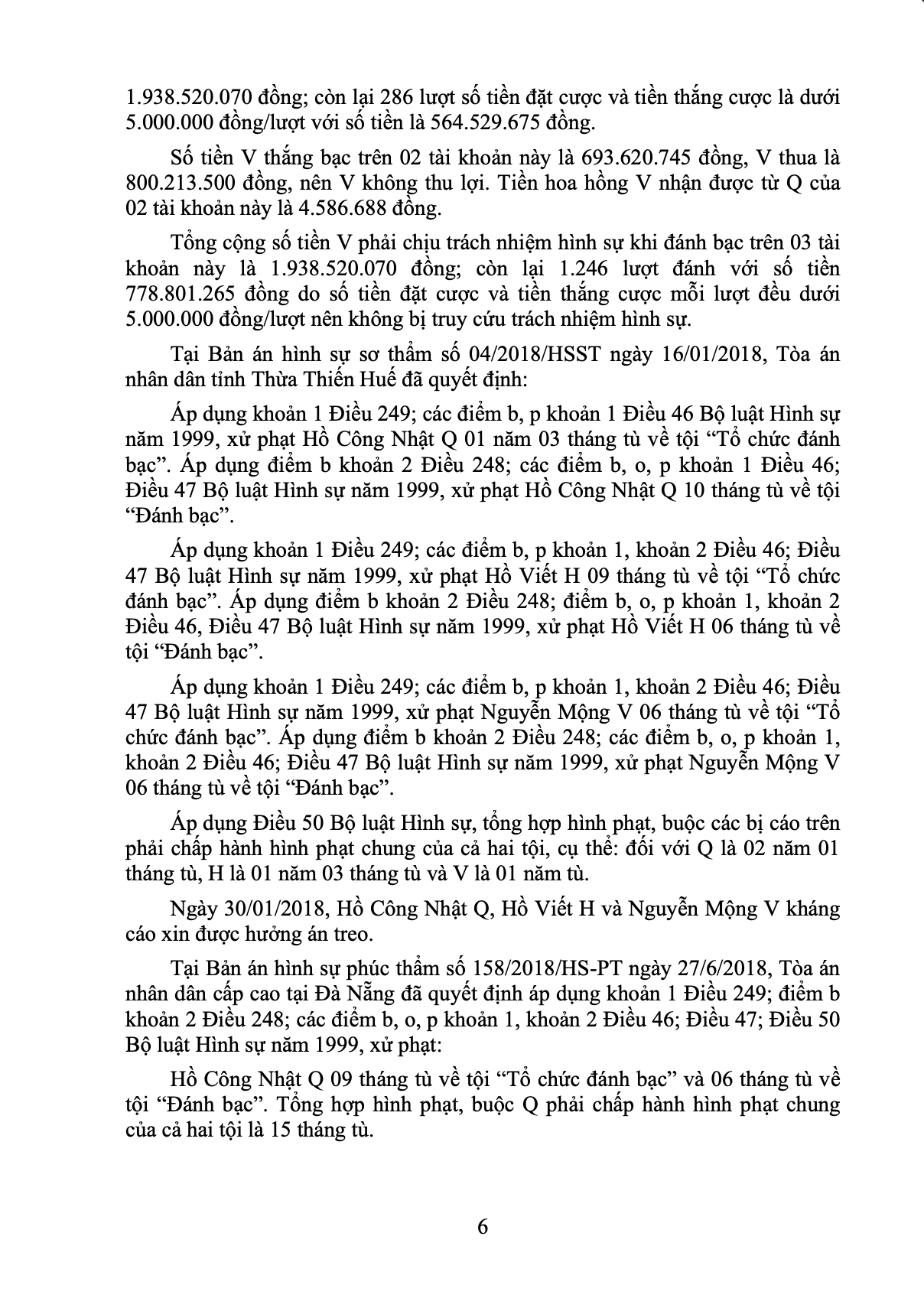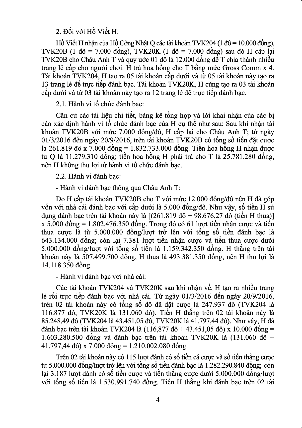 - Hồ Viết H: Nhận 03 tài khoản từ Q với các mức giá 7.000 - 10.000 đồng/đô. H cấp lại 01 tài khoản cho cấp dưới (nâng giá lên 12.000 đồng/đô) và dùng 02 tài khoản còn lại tạo các trang lẻ để trực tiếp đánh bạc. Đối với tội "Tổ chức đánh bạc", H chịu trách nhiệm với số tiền hơn 1,83 tỷ đồng (tuy nhiên không thu được lợi nhuận do tiền hoa hồng chi ra lớn hơn nhận vào). Đối với tội "Đánh bạc", tổng số tiền H tham gia cá cược bị xử lý hình sự là hơn 1,92 tỷ đồng.
