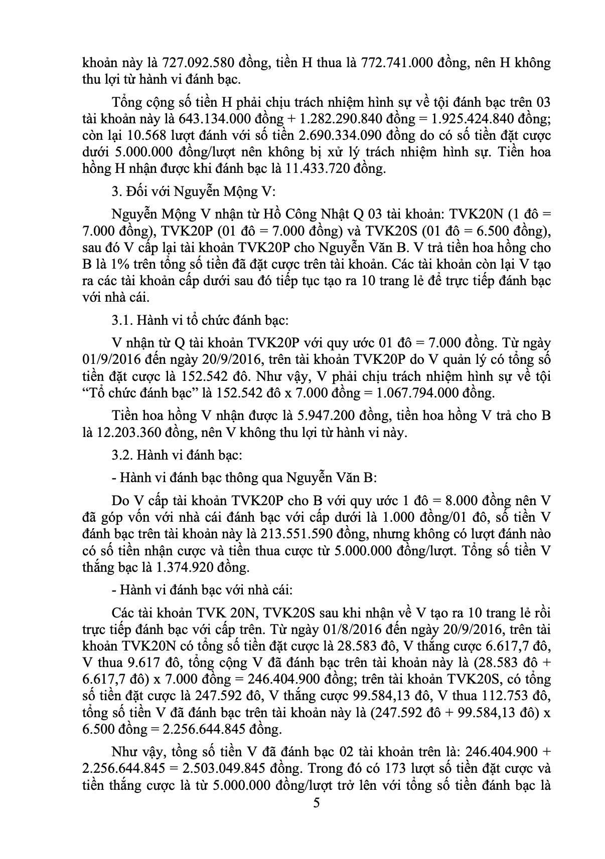 - Nguyễn Mộng V: Nhận 03 tài khoản từ Q với mức giá 6.500 - 7.000 đồng/đô. V cấp lại 01 tài khoản cho người khác (nâng giá lên 8.000 đồng/đô) và giữ lại 02 tài khoản tạo thành 10 trang lẻ để trực tiếp đánh bạc. Về tội "Tổ chức đánh bạc", V chịu trách nhiệm với số tiền hơn 1,06 tỷ đồng (không thu lợi nhuận). Về tội "Đánh bạc", số tiền V trực tiếp tham gia cá cược bị truy cứu trách nhiệm hình sự là hơn 1,93 tỷ đồng.
