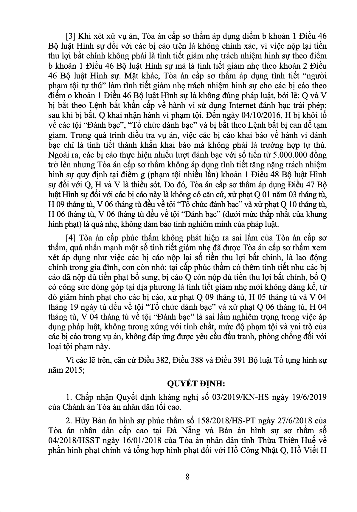 Tại Bản án sơ thẩm ngày 16/01/2018, TAND tỉnh Thừa Thiên Huế tuyên phạt hình phạt chung cho cả hai tội danh: Q lĩnh 25 tháng tù, H lĩnh 15 tháng tù và V lĩnh 12 tháng tù. Sau khi các bị cáo kháng cáo xin hưởng án treo, TAND cấp cao tại Đà Nẵng xét xử phúc thẩm vào ngày 27/6/2018 đã quyết định giảm án cho cả ba: Q còn 15 tháng tù, H còn 09 tháng tù và V còn 08 tháng 19 ngày tù. Tuy nhiên, nhận thấy có vấn đề trong việc áp dụng pháp luật, ngày 19/6/2019, Chánh án TAND tối cao đã ra Quyết định kháng nghị giám đốc thẩm, đề nghị hủy cả bản án phúc thẩm và sơ thẩm về phần hình phạt chính của ba bị cáo để giao hồ sơ xét xử sơ thẩm lại từ đầu. Tại phiên tòa giám đốc thẩm, đại diện Viện kiểm sát nhân dân tối cao cũng hoàn toàn nhất trí với quyết định kháng nghị này.