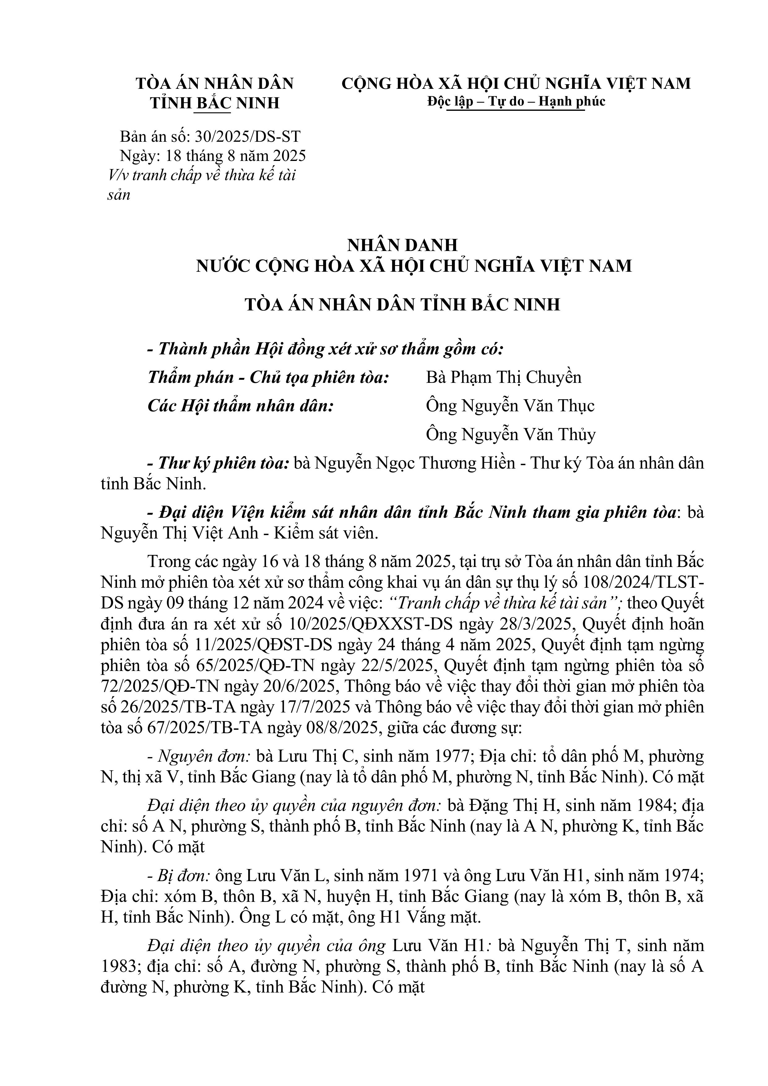 * Thông tin chi tiết về việc phân chia di sản thừa kế có tại Bản án số 30/2025/DS-ST ngày 18/08/2025 của Tòa án nhân dân tỉnh Bắc Ninh dưới đây.