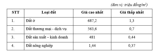 Bảng số liệu trên phản ánh khái quát mức giá đất theo từng