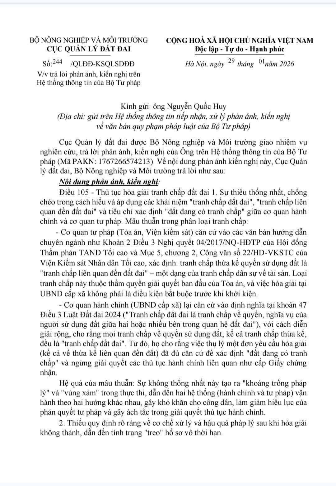 29/01/2026, Cục Quản lý đất đai đã ban hành Công văn số 244/QLĐĐ-KSQLSDĐĐ nhằm trả lời phản ánh của ông Nguyễn