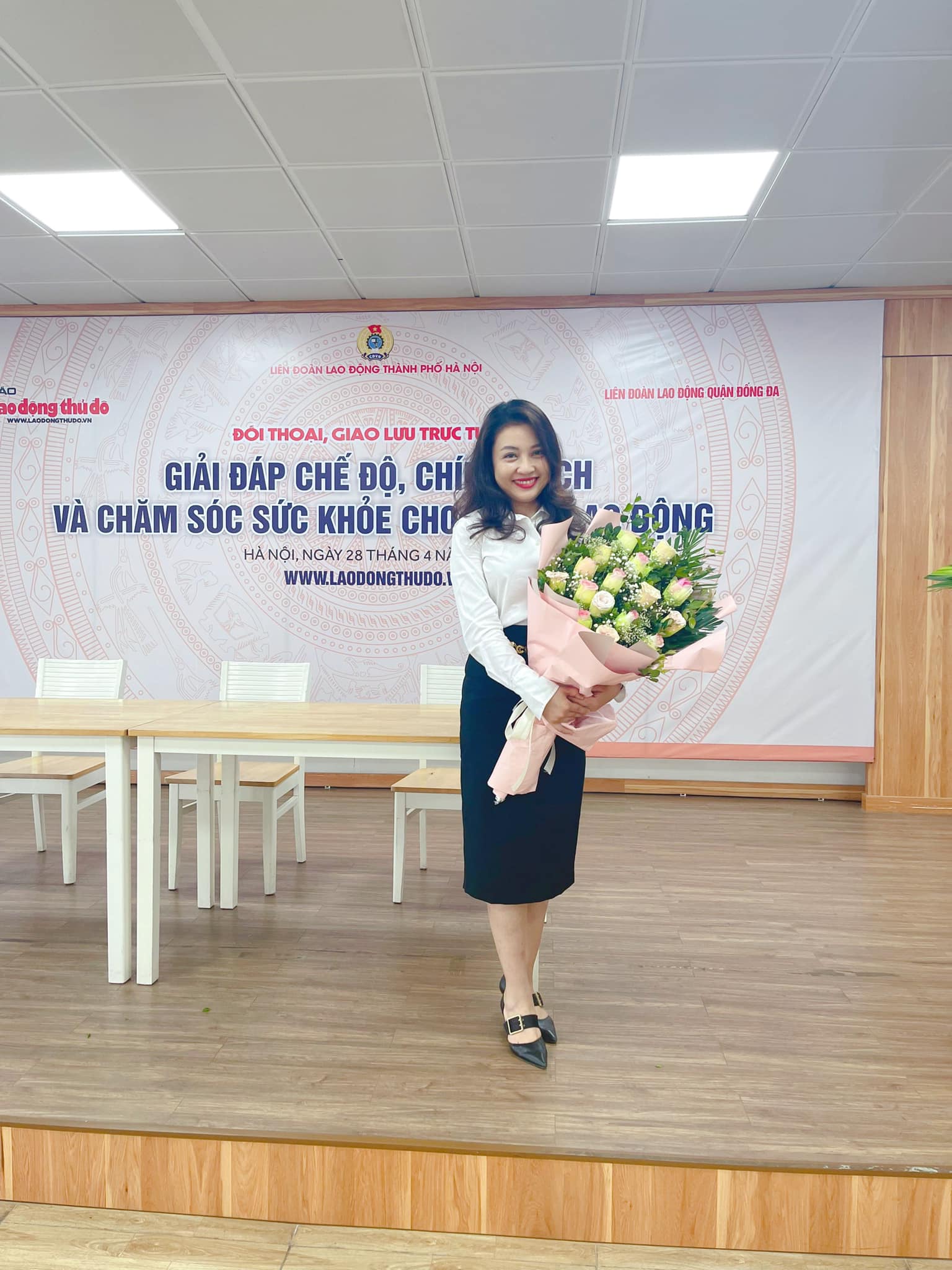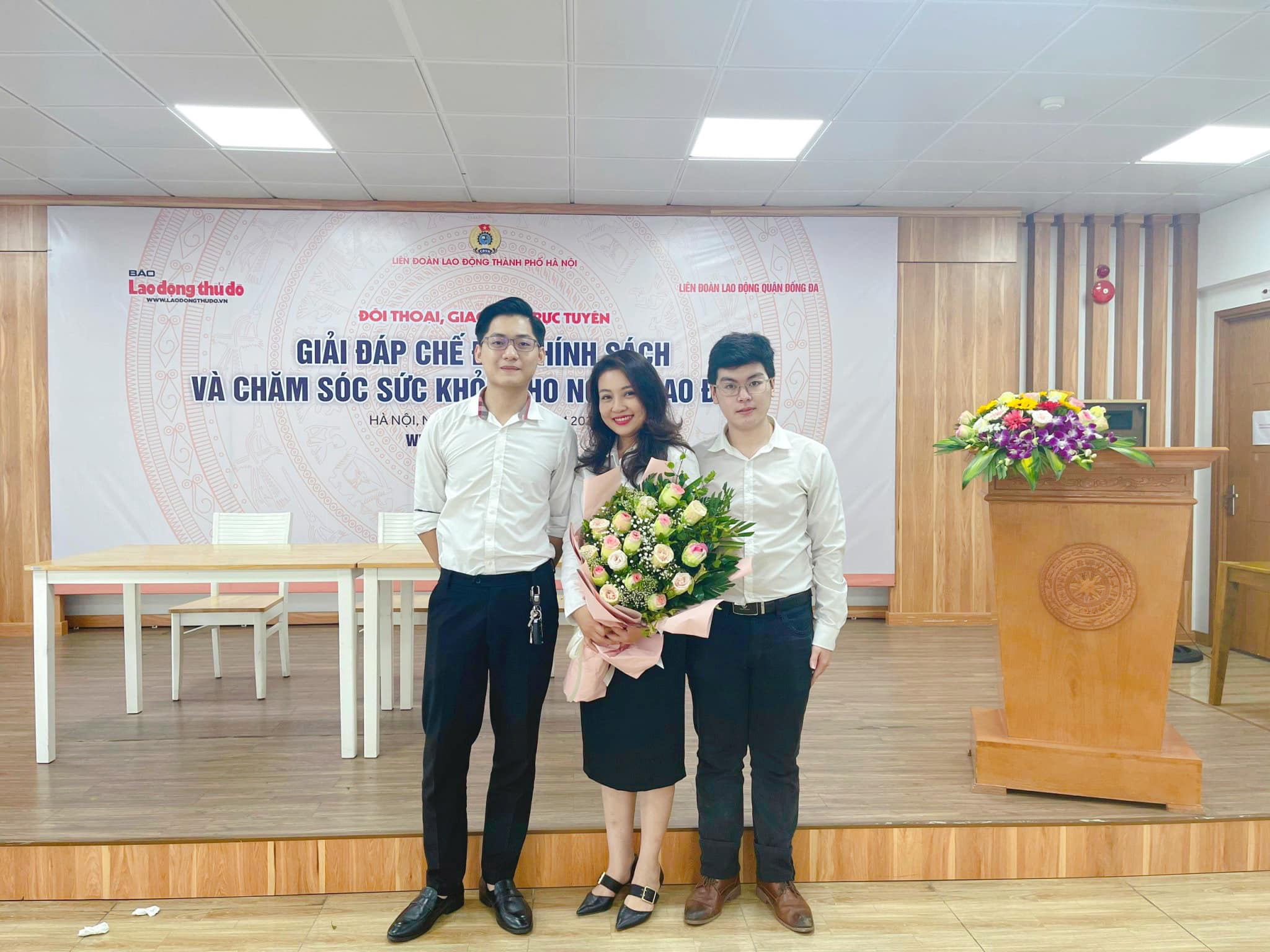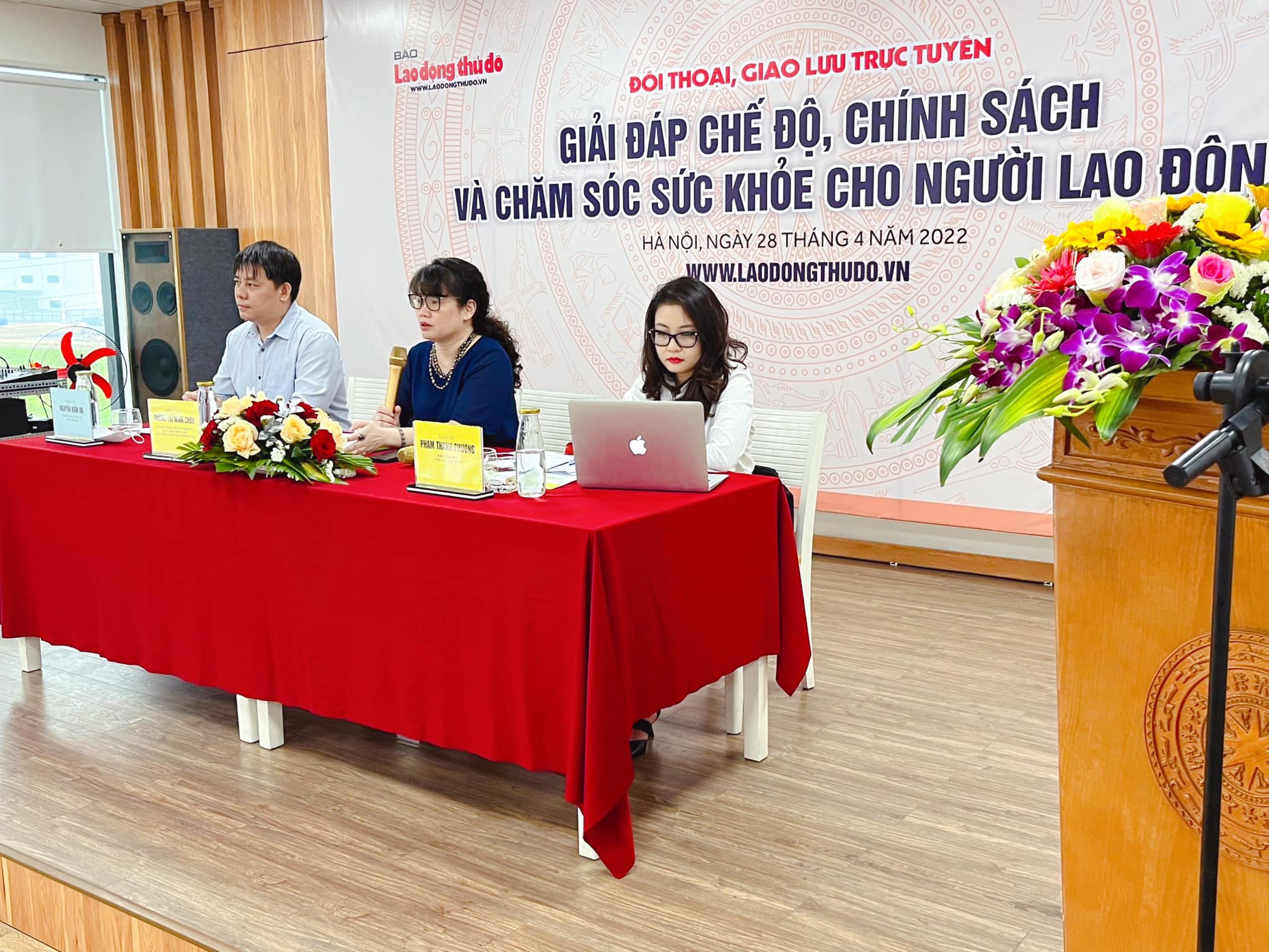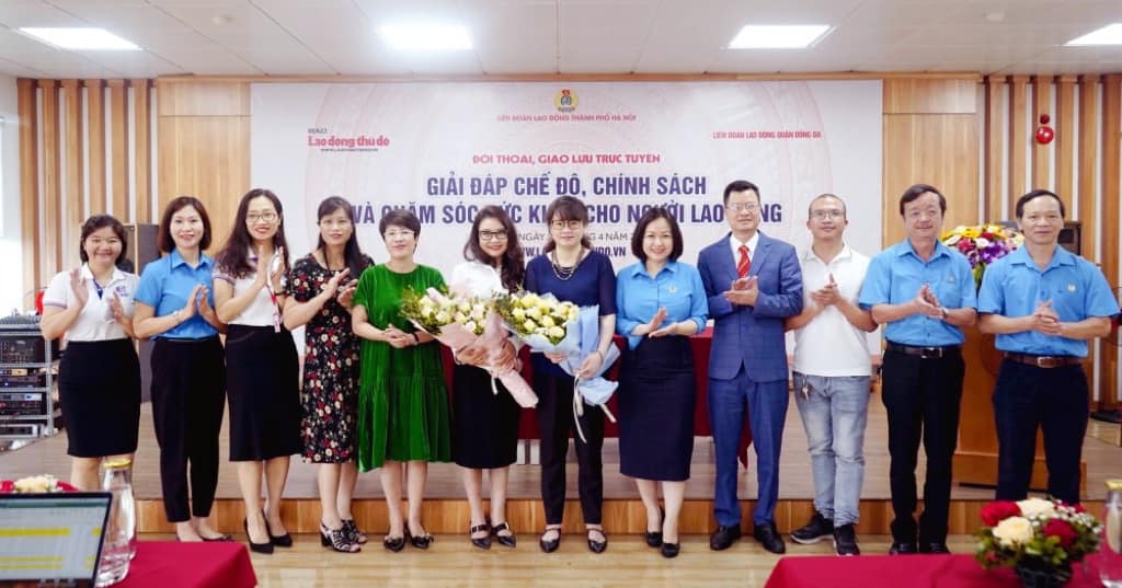 Luật sư Phạm Thị Thanh Phương - Công ty Luật TNHH XTVN tham gia giải đáp thắc mắc cho người lao động. Sáng nay (28/4), gần 200 đoàn viên công đoàn và người lao động thuộc Liên đoàn Lao động (LĐLĐ) quận Đống Đa tham gia Giao lưu trực tuyến với chủ đề “Giải đáp chế độ, chính sách và chăm sóc sức khỏe cho người lao động”.