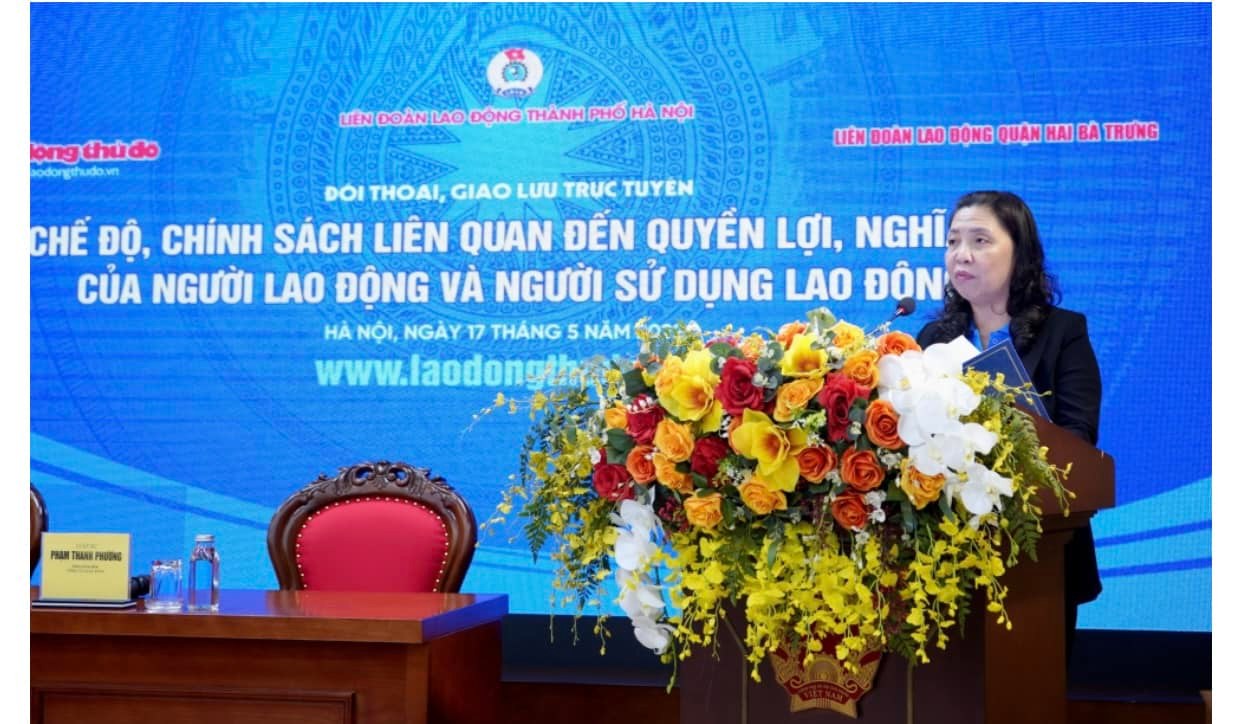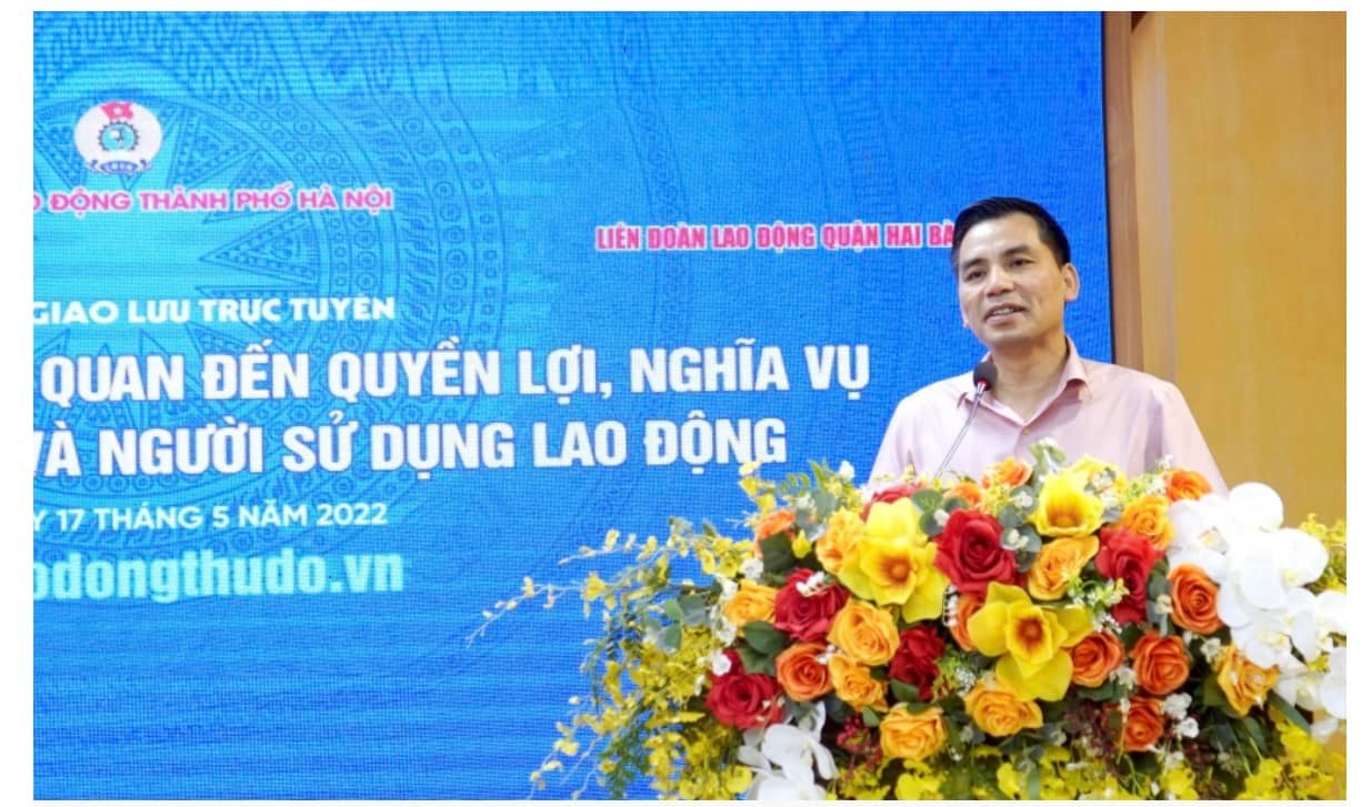 Sáng nay (17/5), gần 300 đoàn viên công đoàn, người lao động (NLĐ) tham gia buổi Đối thoại - Giao lưu trực tuyến với chủ đề "Chế độ, chính sách liên quan đến quyền lợi, nghĩa vụ của người lao động và người sử dụng lao động" do báo Lao động Thủ đô phối hợp với Liên đoàn Lao động (LĐLĐ) quận Hai Bà Trưng tổ chức. Chương trình được truyền trực tuyến từ Hội trường Ủy ban nhân dân quận Hai Bà Trưng, thành phố Hà Nội.