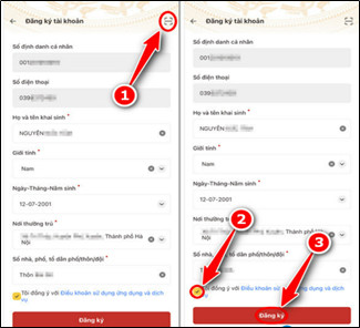 - Cách 2: Nhập thủ công từng thông tin trên thẻ CCCD gắn chip, sau đó tích Điều khoản sử dụng ứng dụng và dịch vụ => Nhấn nút Đăng ký.