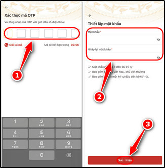 Bước 4: Nhập mã OTP được gửi về Số điện thoại bạn đã đăng ký =>Thiết lập mật khẩu cho tài khoản VNeID => nhấn Xác nhận.