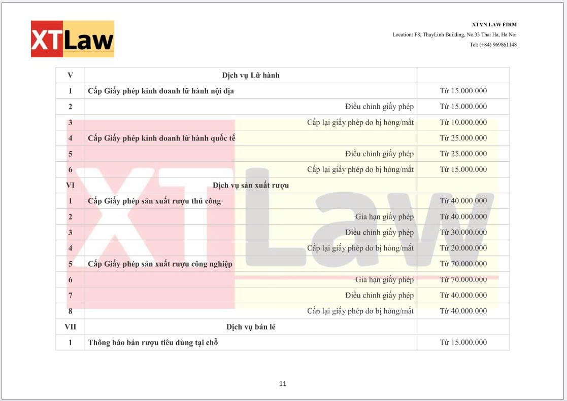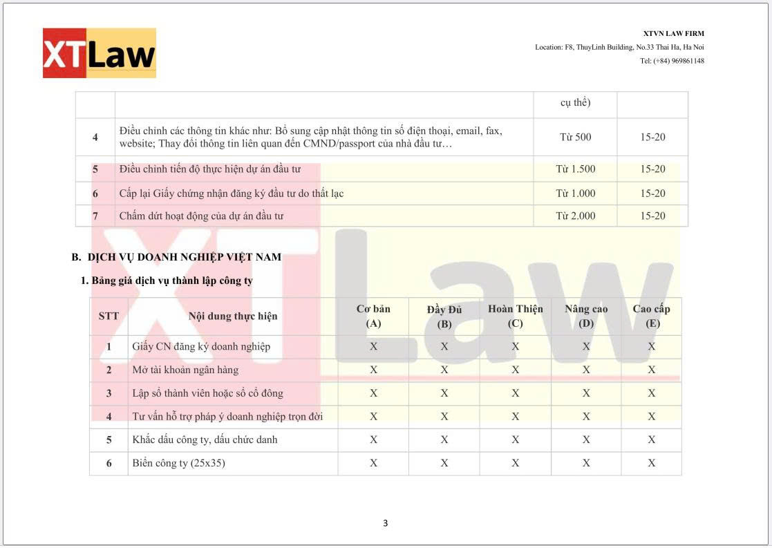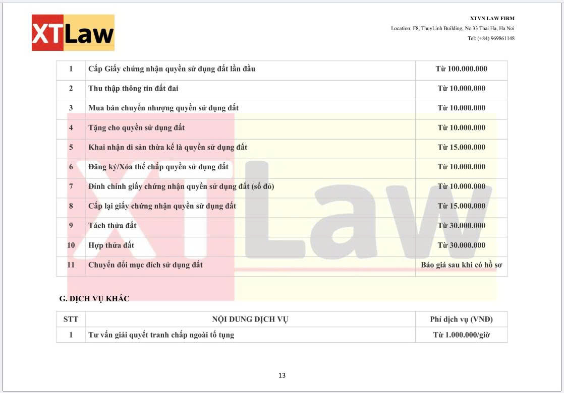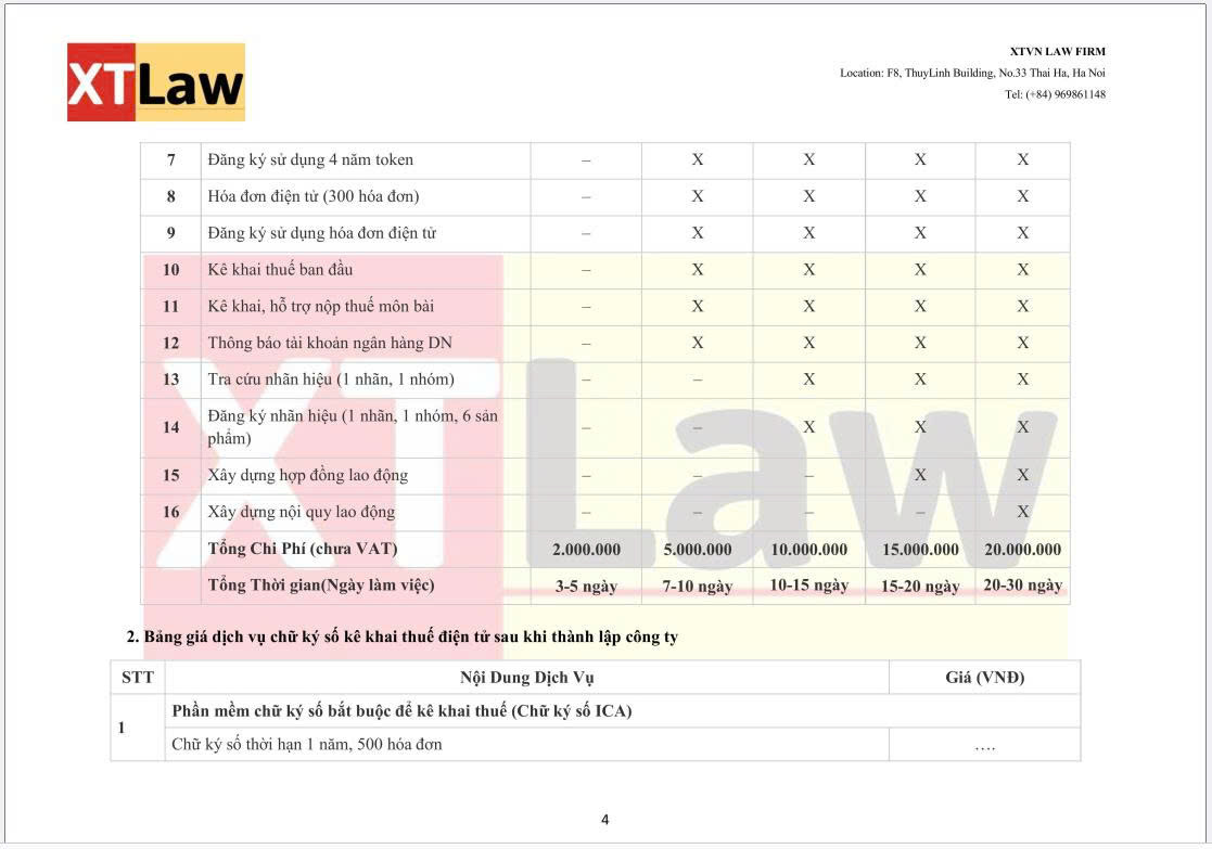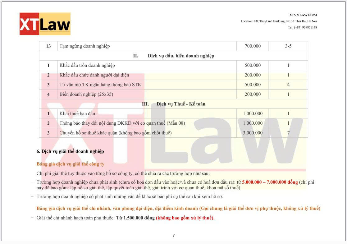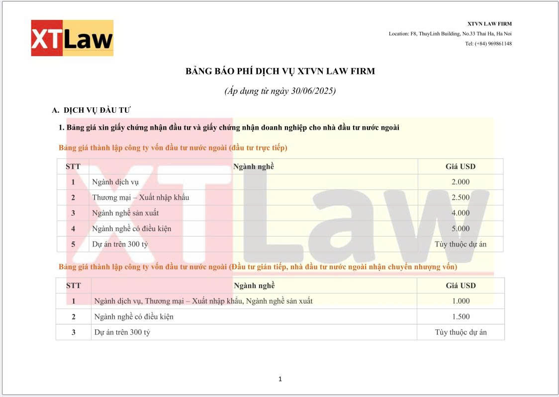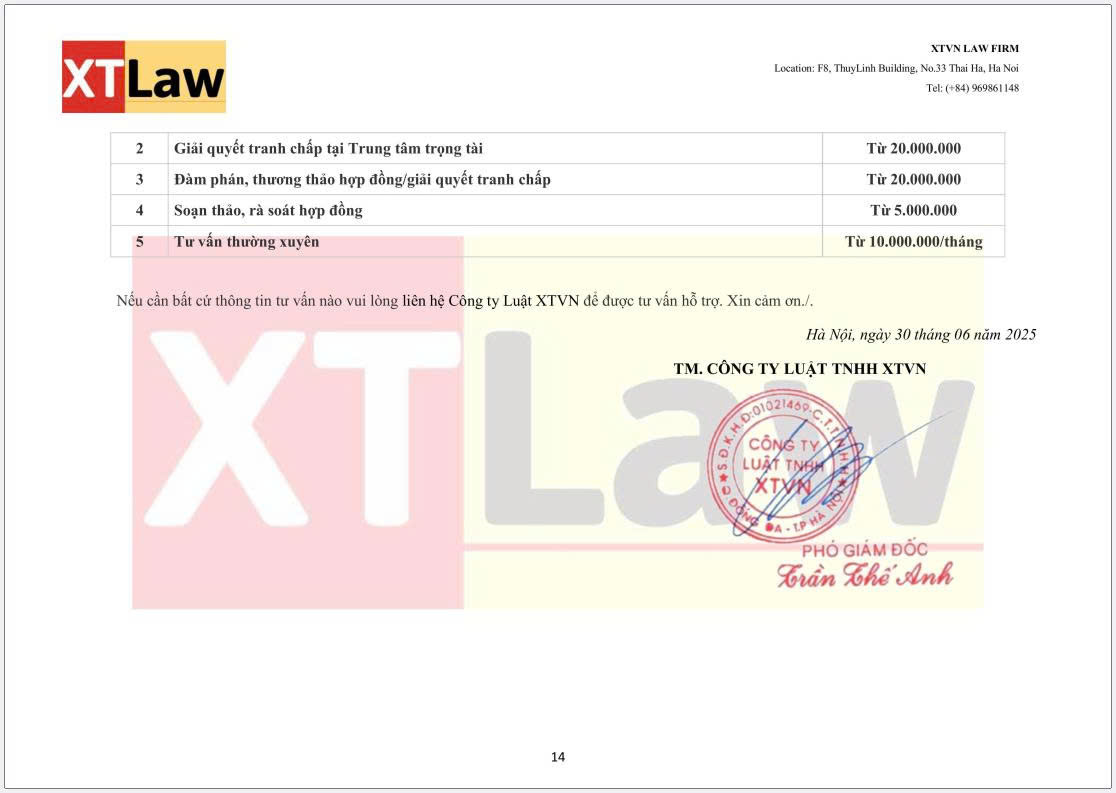 BẢNG BÁO PHÍ DỊCH VỤ XTVN LAW FIRM (áp dụng từ ngày 30/06/2025)