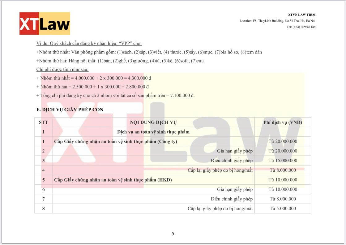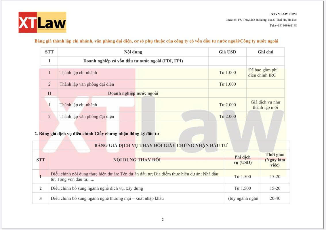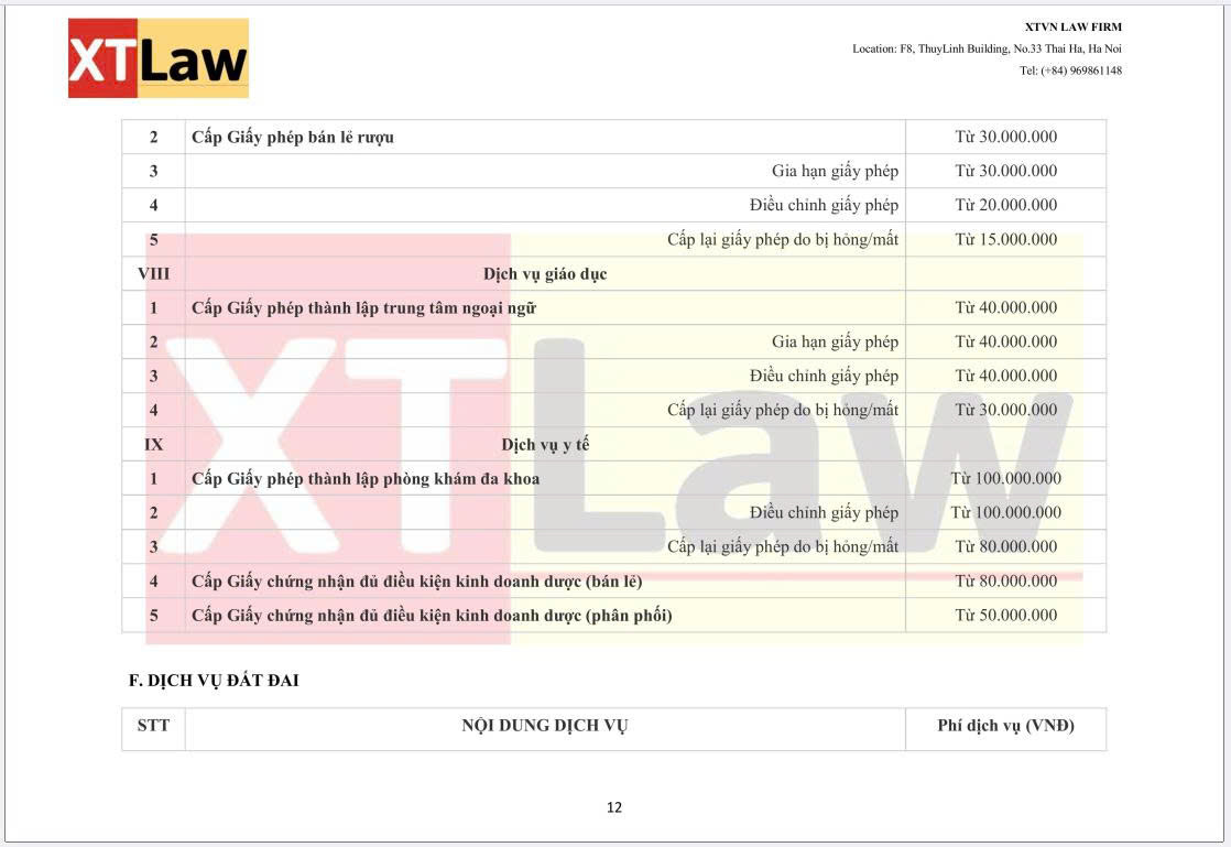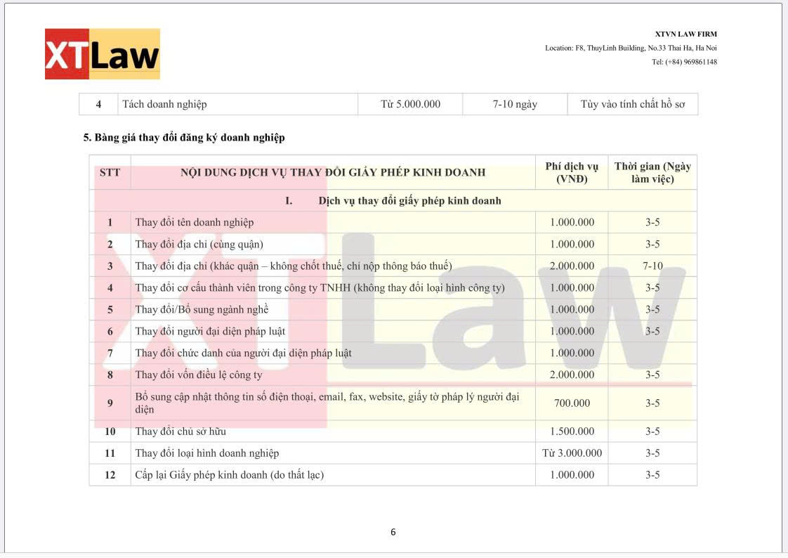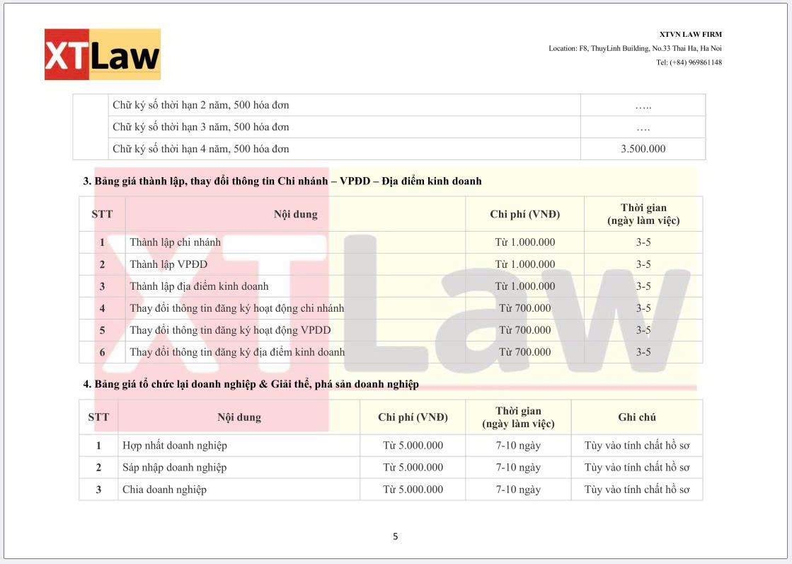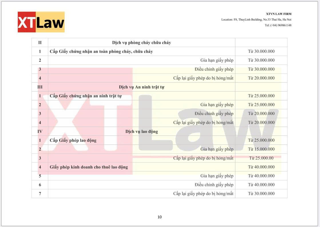 BẢNG BÁO PHÍ DỊCH VỤ XTVN LAW FIRM (áp dụng từ ngày 30/06/2025)