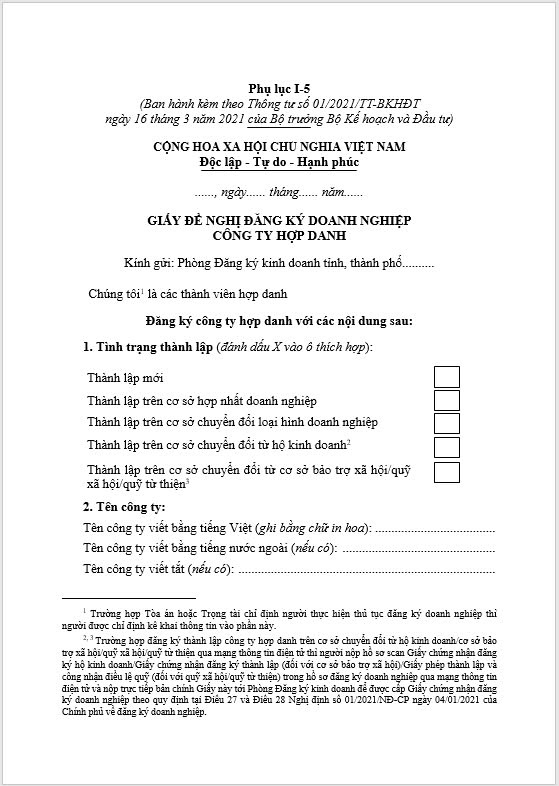 Giấy đề nghị đăng ký doanh nghiệp Công ty hợp danh
