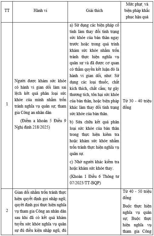 Những hành vi được coi là gian dối khi khám sơ tuyển sức khỏe nghĩa vụ quân sự và hình thức xử lý được quy định như sau: