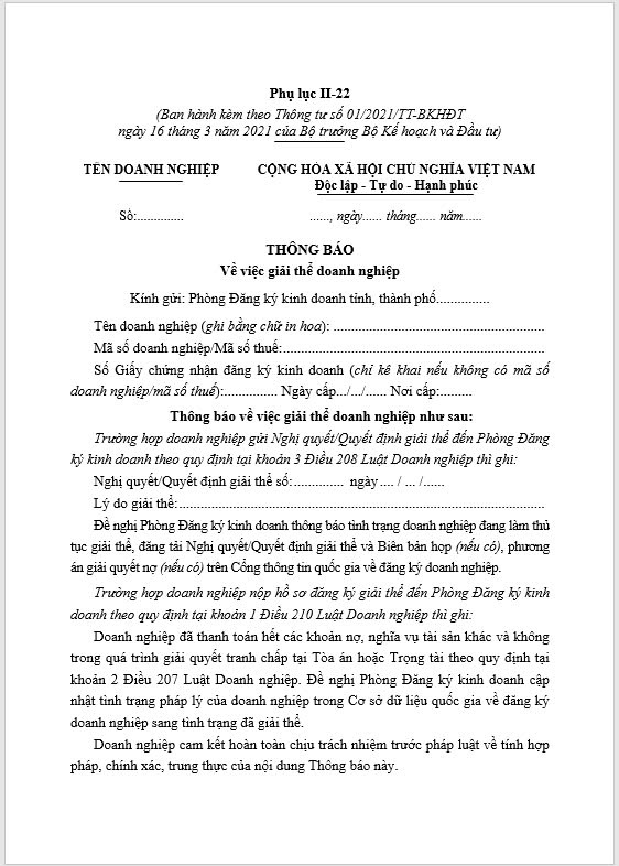 Thông báo Về việc giải thể doanh nghiệp