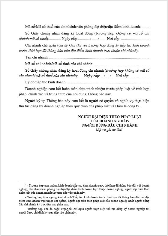 Thông báo Về việc tạm ngừng kinh doanh/tiếp tục kinh doanh Trước thời hạn đã thông báo của doanh nghiệp/ Chi nhánh/văn phòng đại diện/địa điểm kinh doanh