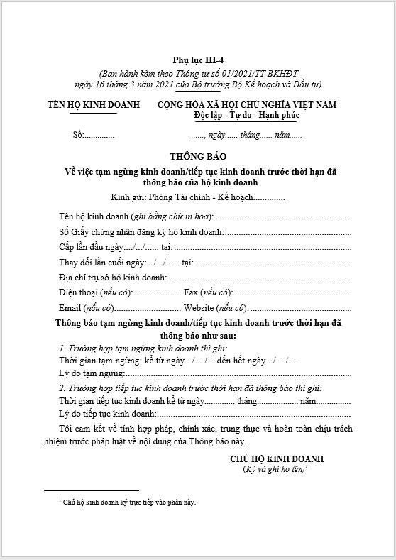 Thông báo Về việc tạm ngừng kinh doanh/tiếp tục kinh doanh trước thời hạn đã thông báo của hộ kinh doanh
