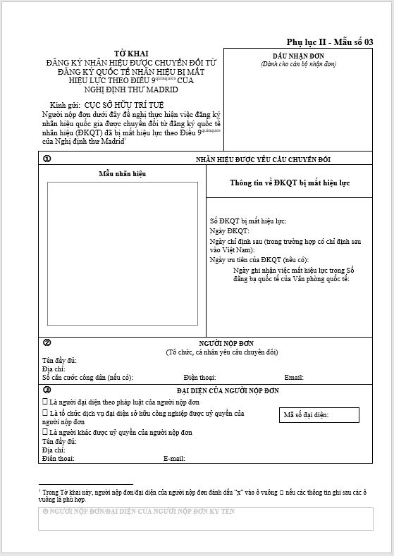 Tờ khai Đăng ký nhãn hiệu được chuyển đổi từ đăng ký quốc tế nhãn hiệu bị mất Hiệu lực theo điều 9quinquies của Nghị định thư madrid
