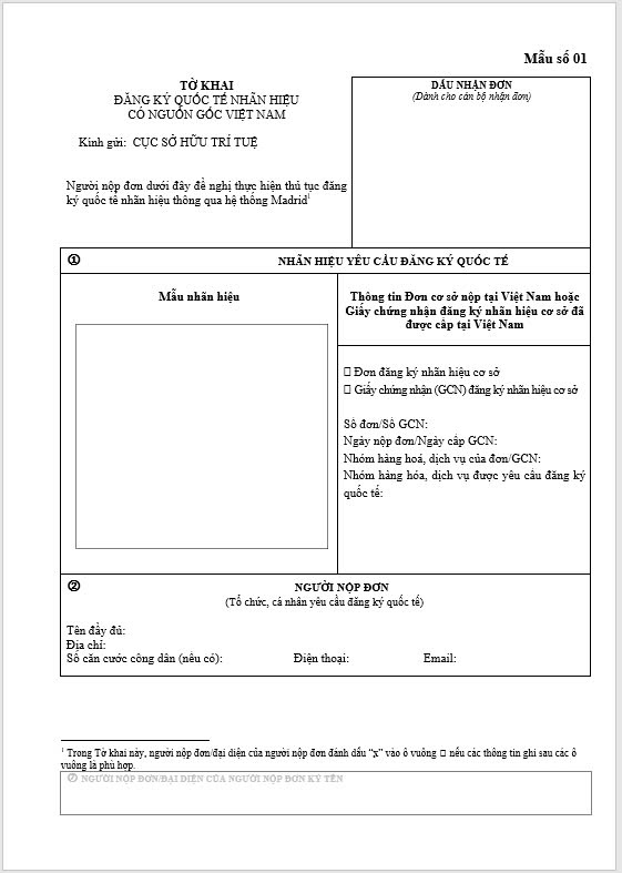Tờ khai đăng ký quốc tế nhãn hiệu có nguồn gốc Việt Nam