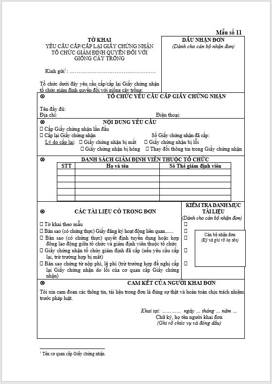 Tờ khai Yêu cầu cấp/cấp lại giấy chứng nhận tổ chức giám định quyền đối với giống cây trồng