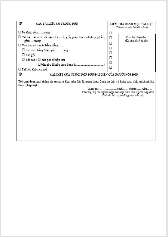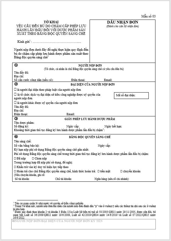 Tờ khai Yêu cầu đền bù do chậm cấp phép lưu hành lần đầu đối với dược phẩm sản xuất theo bằng độc quyền sáng chế