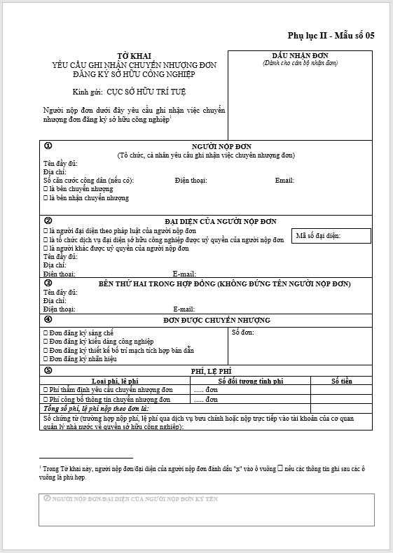 Tờ khai yêu cầu ghi nhận chuyển nhượng đơn đăng ký sở hữu công nghiệp
