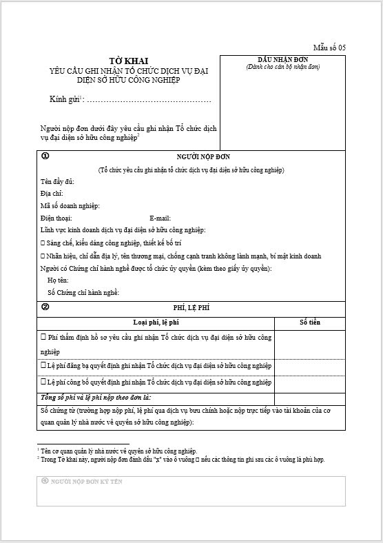 Tờ khai Yêu cầu ghi nhận tổ chức dịch vụ đại diện sở hữu công nghiệp