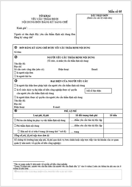 Tờ khai Yêu cầu thẩm định Nội dung đơn đăng ký sáng chế