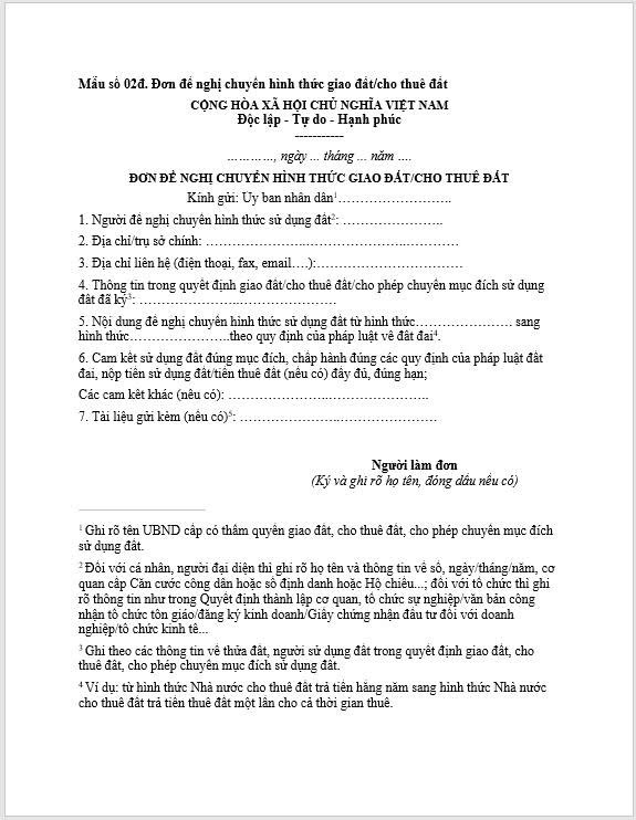 Mẫu số 02đ. Đơn đề nghị chuyển hình thức giao đất/cho thuê đất