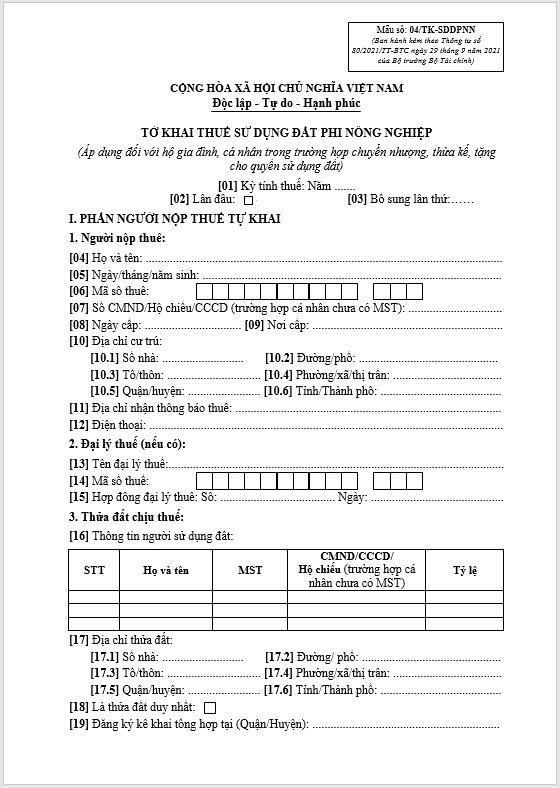 Mẫu số 04_TK-SDDPNN - Tờ khai thuế sử dụng đất phi nông nghiệp