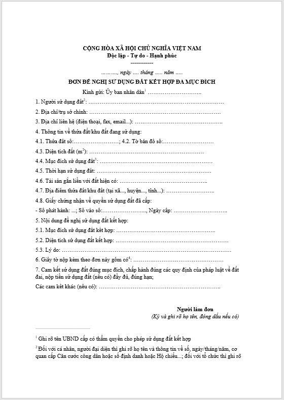 Đơn đề nghị sử dụng đất kết hợp đa mục đích