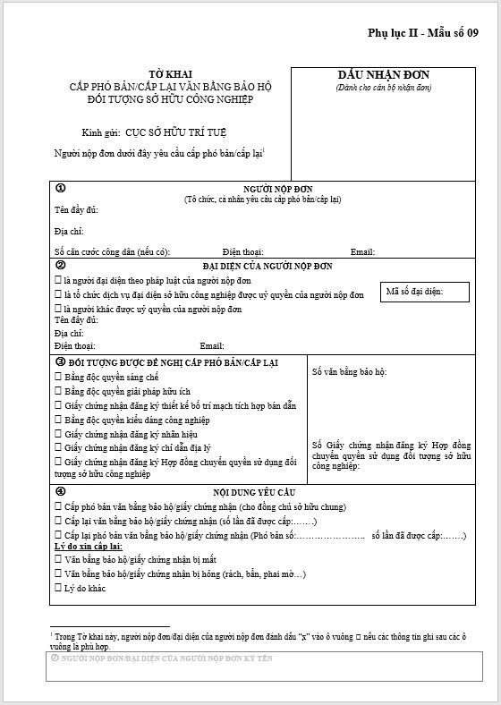 Tờ khai Cấp phó bản/cấp lại văn bằng bảo hộ Đối tượng sở hữu công nghiệp