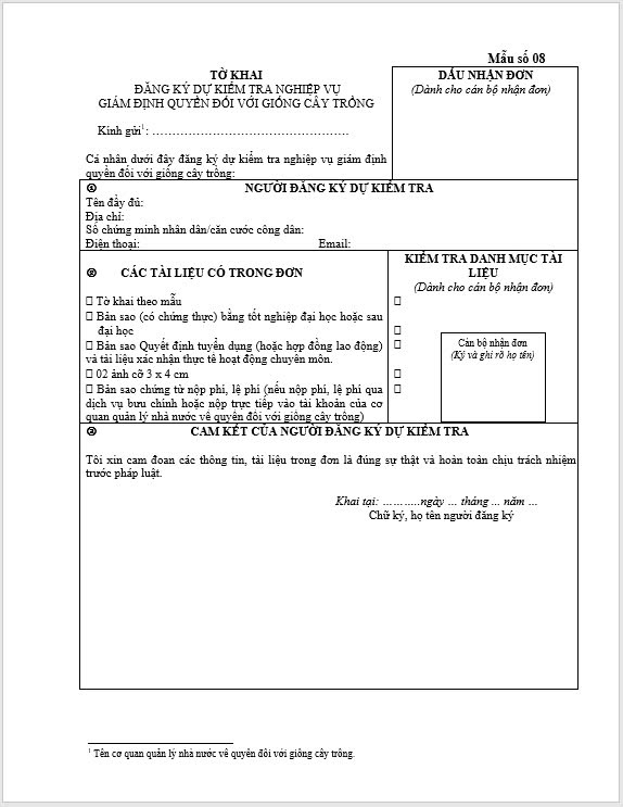Tờ khai đăng ký dự kiểm tra nghiệp vụ Giám định quyền đối với giống cây trồng