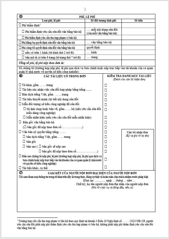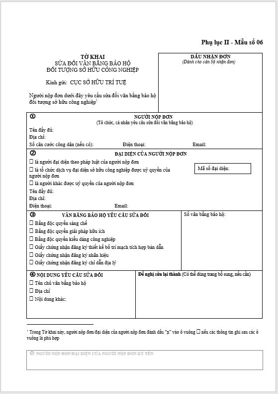 Tờ khai Sửa đổi văn bằng bảo hộ Đối tượng sở hữu công nghiệp