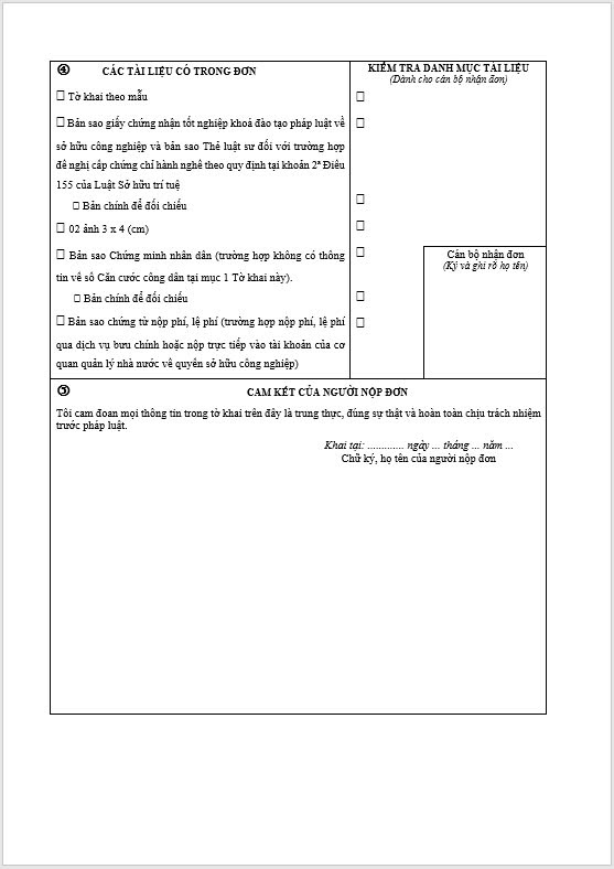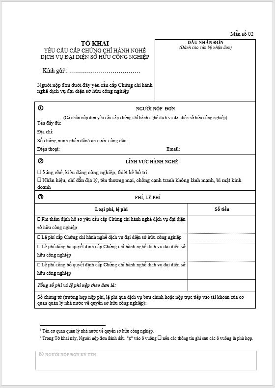 Tờ khai Yêu cầu cấp chứng chỉ hành nghề Dịch vụ đại diện sở hữu công nghiệp