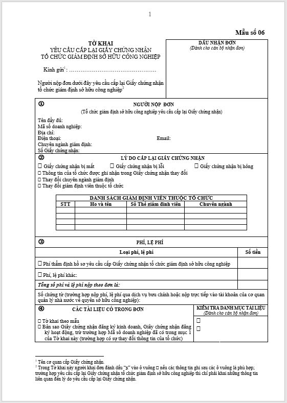 Tờ khai yêu cầu cấp lại giấy chứng nhận tổ chức giám định sở hữu công nghiệp