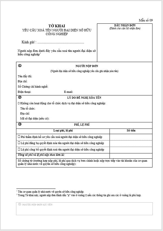 Tờ khai Yêu cầu xoá tên người đại diện sở hữu Công nghiệp