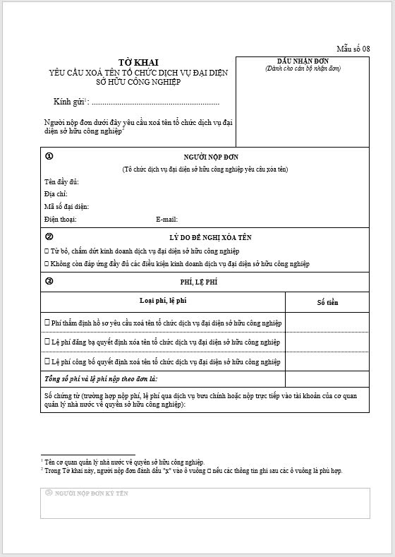 Tờ khai yêu cầu xoá tên tổ chức dịch vụ đại diện sở hữu công nghiệp