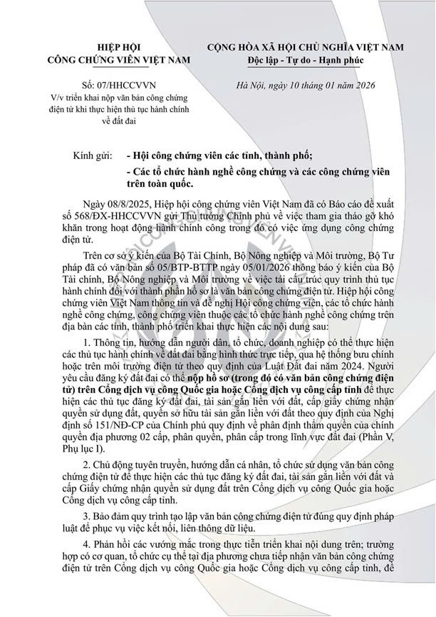 Ngày 8/8/2025 Hiệp hội công chứng viên Việt Nam đã có Báo cáo đề xuất 568/ĐX-HHCCVVN gửi Thủ tướng Chính phủ về việc tham gia tháo gỡ khó khăn trong hoạt động hành chính công trong đó có việc ứng dụng công chứng điện tử.