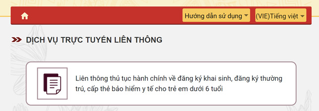Bước 2: Chọn mục "Liên thông thủ tục hành chính về đăng ký khai sinh, đăng ký thường trú, cấp thẻ bảo hiểm y tế cho trẻ em dưới 06 tuổi":
