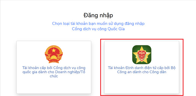 Bước 3: Đăng nhập vào Cổng dịch vụ công Quốc gia bằng “Tài khoản Định danh điện tử cấp bởi Bộ Công an dành cho Công dân”: